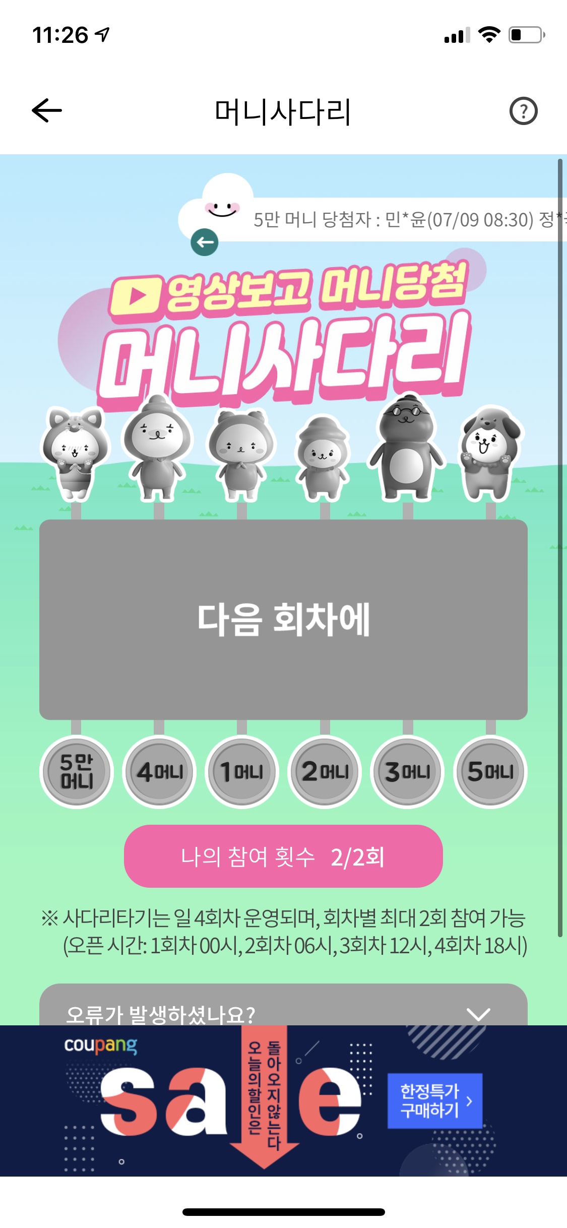 - 일 4회차 운영되고, 회차별 2번씩 참여 가능해요~ 광고 보고 2번씩 하루 4번이면 총 8회 머니적립이 가능합니다^^