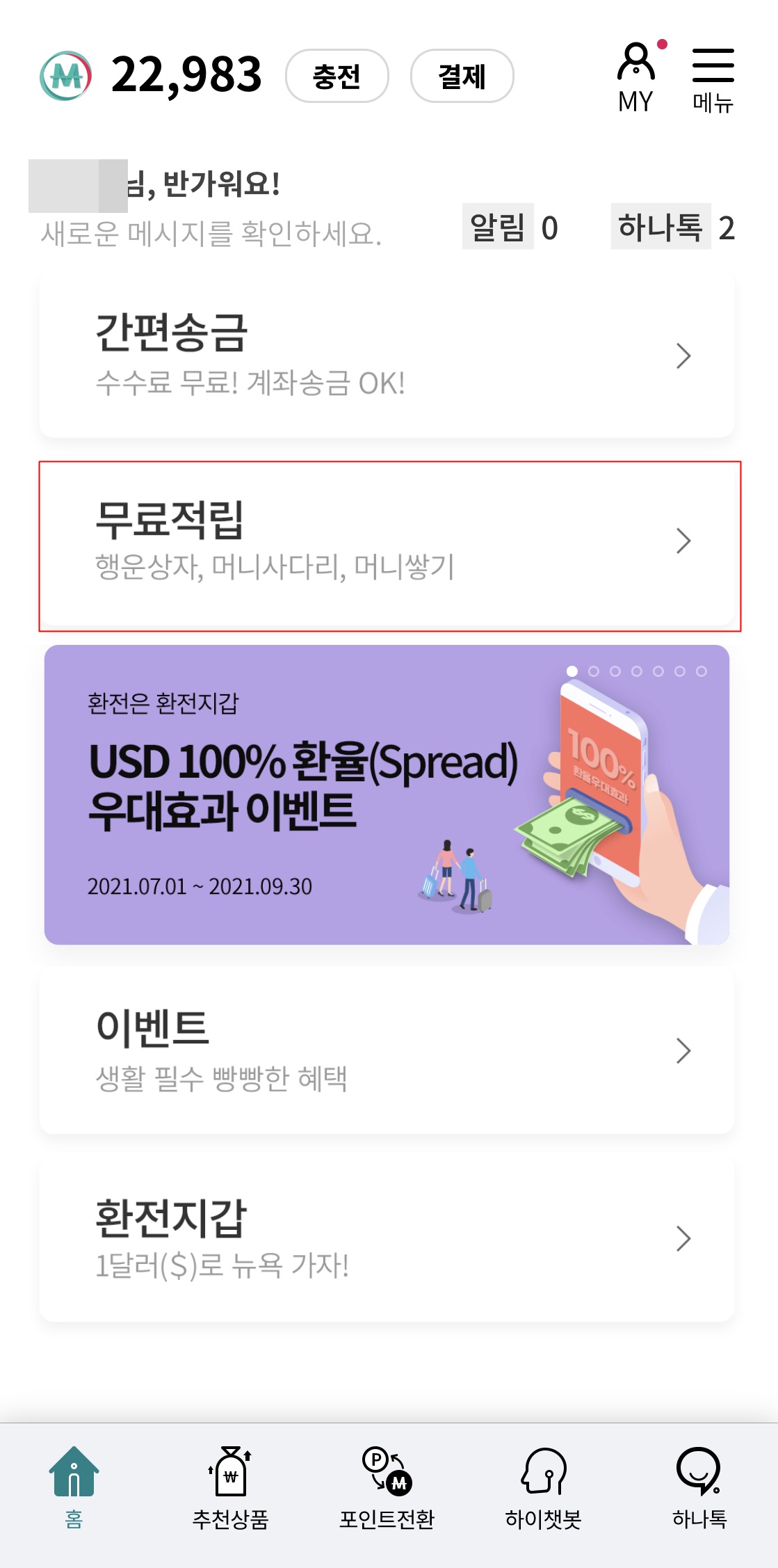 3-1. 아래 하단 홈을 누르면 무료적립이라는 탭이 나옵니다.